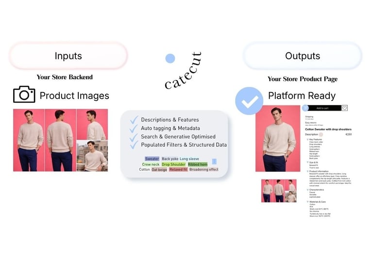 Catecut focuses on turning product imagery into structured product attributes that can be used directly in e-commerce platforms. Instead of introducing another complex system, Catecut acts as a lightweight layer that: